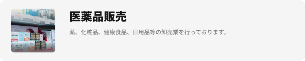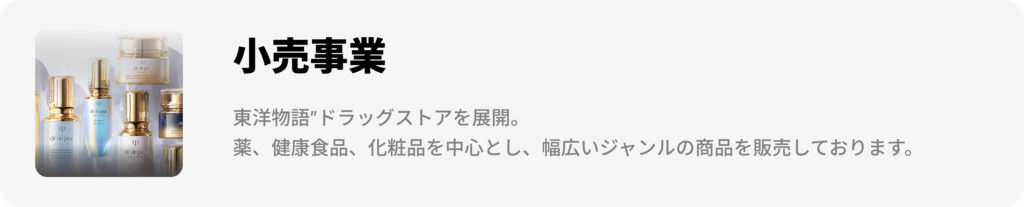 現在、浅草店と御徒町店にて「東洋物語」ドラッグストアを展開し、医薬品・健康食品・化粧品を中心に幅広い商品 を取り扱っております。